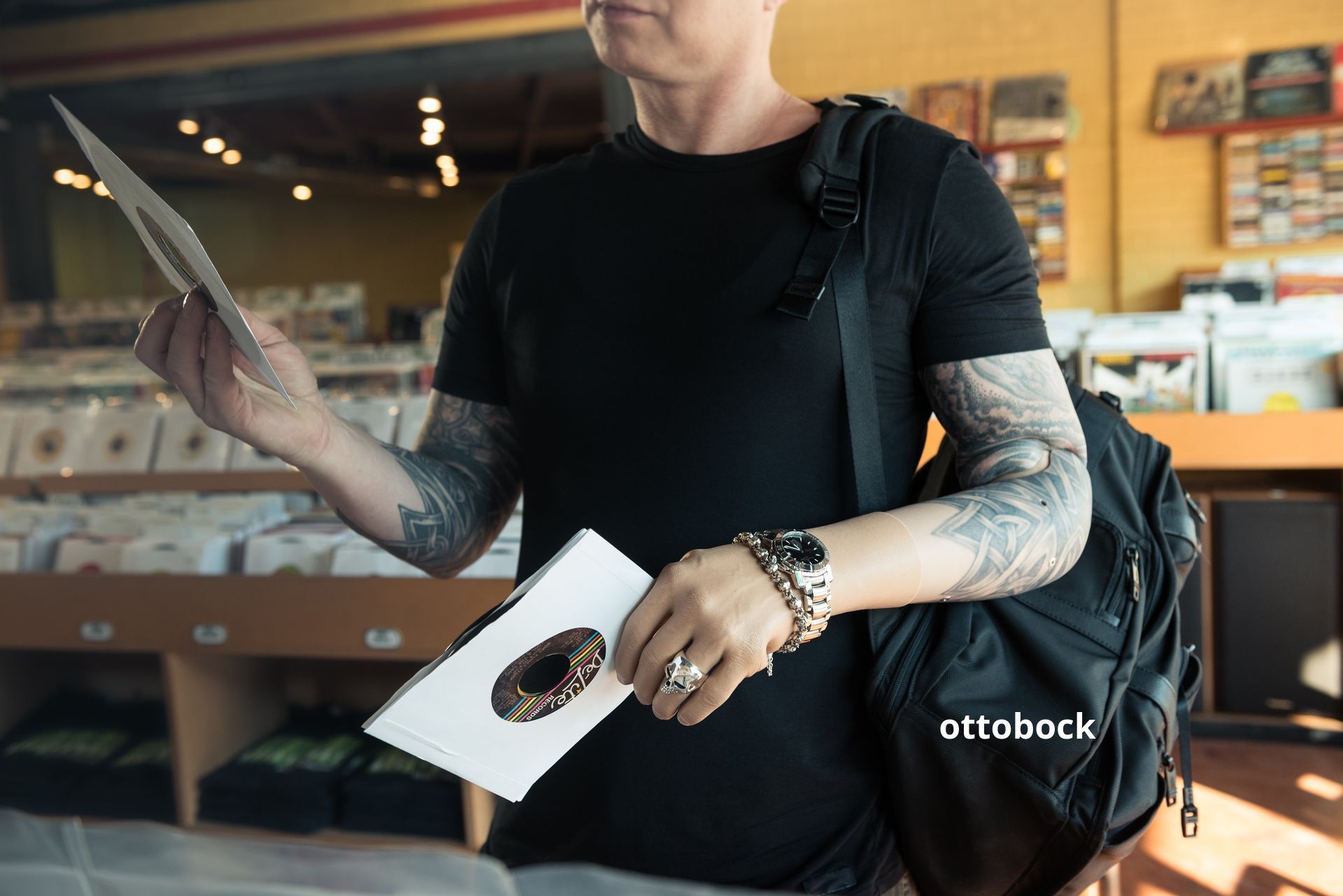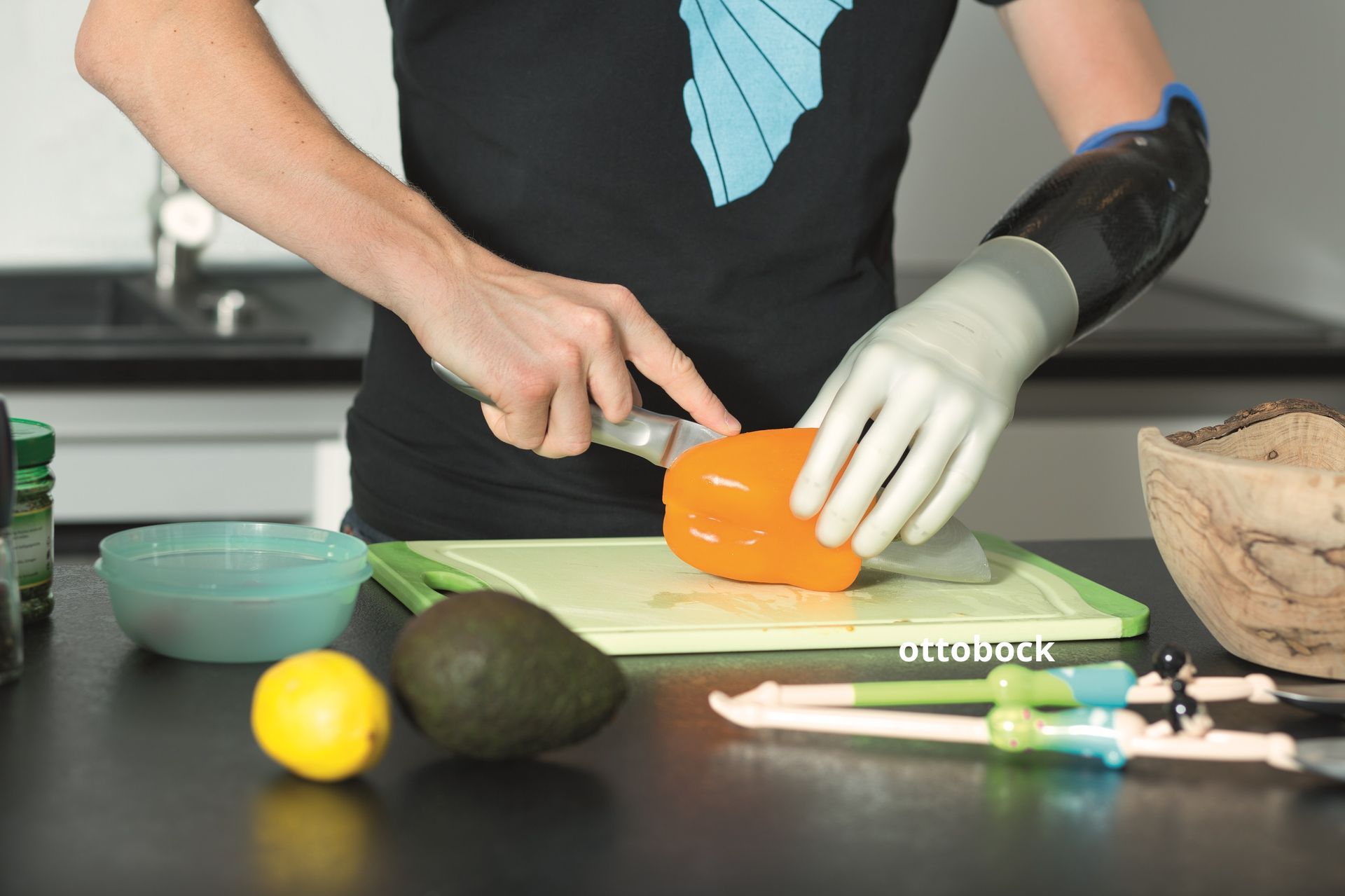 This prosthesis uses electrical impulses from muscles around the residual arm or shoulder to activate and control the hand and wrist. It has over 21 different hand positions so you can do anything from holding a shovel or writing with a pen.